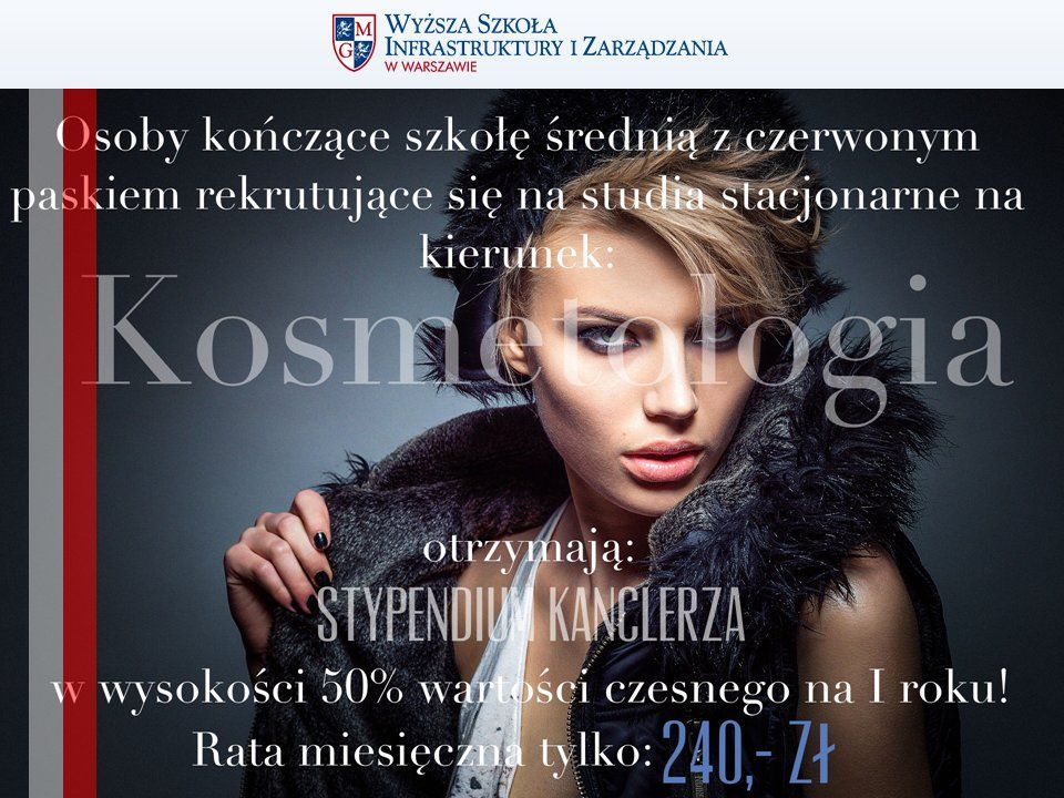 Skończyłeś szkołę średnią z czerwonym paskiem i chcesz studiować kosmetologię? Zapisz się na studia w Wyższej Szkole Infrastruktury i Zarządzania a otrzymasz Stypendium Kanclerza w wysokości 50% wartości czesnego na I rok. Rata miesięczna tylko 240zł.