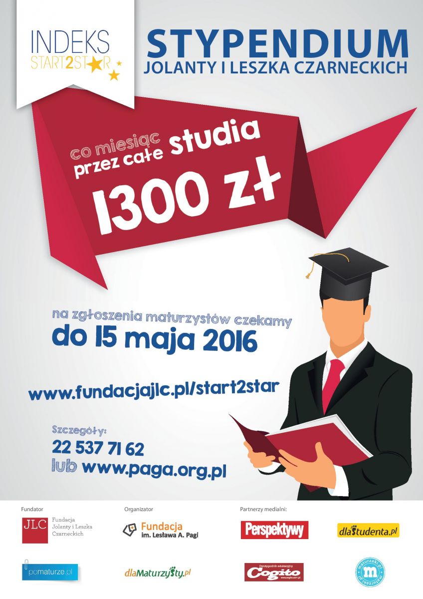 Szukamy ludzi z pasją. Chcemy wspierać te osoby, które już w szkole średniej mają wizję swojej przyszłości i rozwijają swoje zainteresowania. - mówi Ewa Paga, Prezes Zarządu Fundacji im. Lesława A. Pagi - Mimo bezpłatnego systemu edukacji studiowanie na dobrej uczelni to duży koszt. Zależy nam na tym, aby zdolni maturzyści nie musieli rezygnować ze swoich ambicji naukowych z powodu trudności finansowych. Już 140 osób z całej Polski zostało stypendystami projektu Indeks Start2Star, a wartość przyznanych dotychczas stypendiów przekroczyła kwotę 6 milionów złotych. Nie ma znaczenia jaki kierunek studiów wybierasz. Warunkiem przyznania stypendium jest zobowiązanie do przepracowania po studiach 5 lat w Polsce. - Chcemy w ten sposób zachęcić aktywnych, zdolnych ludzi do pozostania w kraju i udowodnić, że w Polsce można zrobić karierę zawodową - dodaje Ewa Paga.