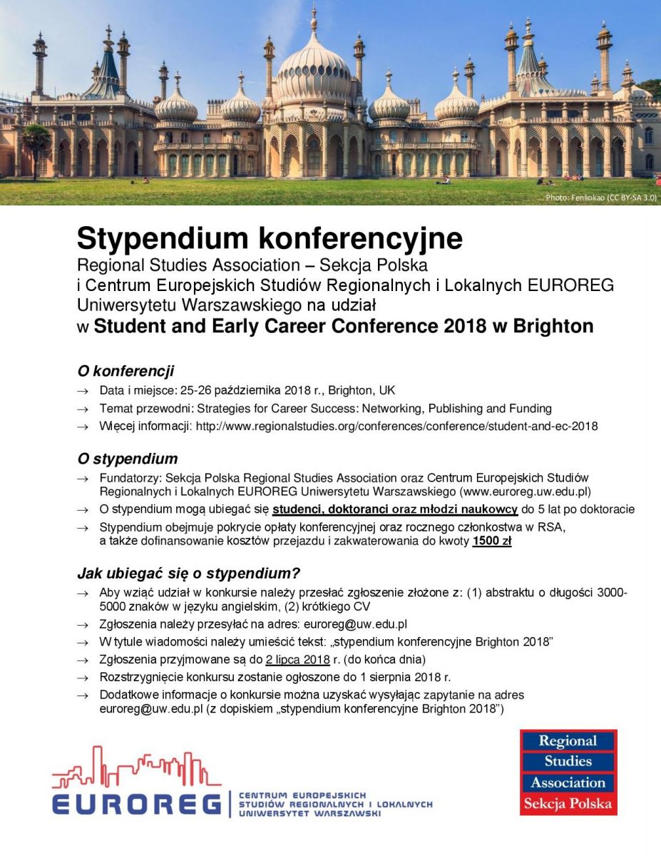 Stypendium konferencyjnym dla studentów i młodych naukowców na udział w Regional Studies Association Student and Early Career Conference 2018 w Brighton (http://www.regionalstudies.org/conferences/conference/student-and-ec-2018. Stypendium obejmuje pokrycie opłaty konferencyjnej oraz rocznego członkostwa w RSA a także dofinansowanie kosztów przejazdu i zakwaterowania do kwoty 1500 zł. O stypendium mogą ubiegać się studenci studiów licencjackich, magisterskich oraz doktoranci i młodzi naukowcy do 5 lat po doktoracie.